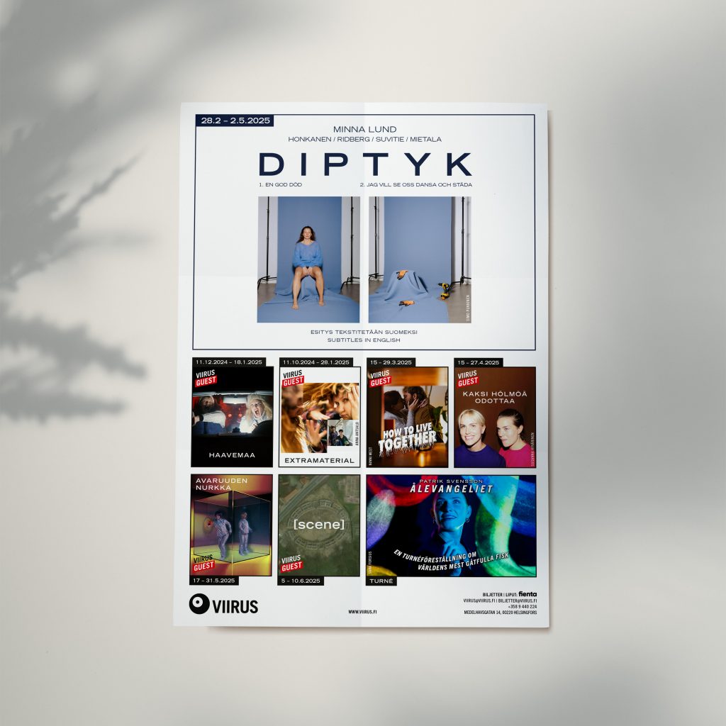 Posters, SoMe material and programmes for turbo theatre project “Premiär på fredag!” at Teater Viirus, 2024.